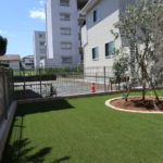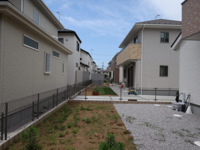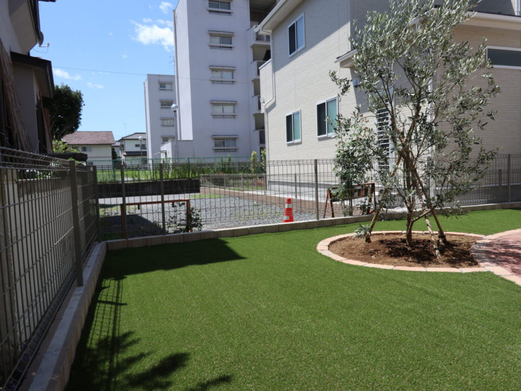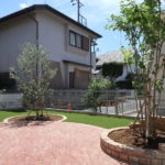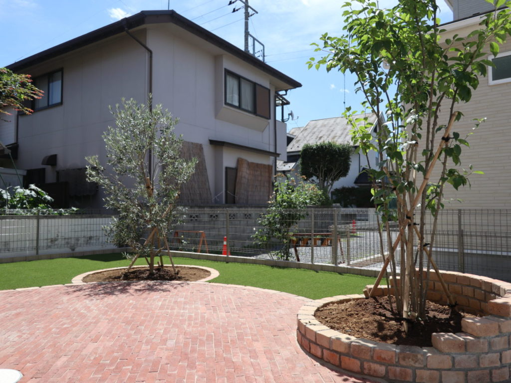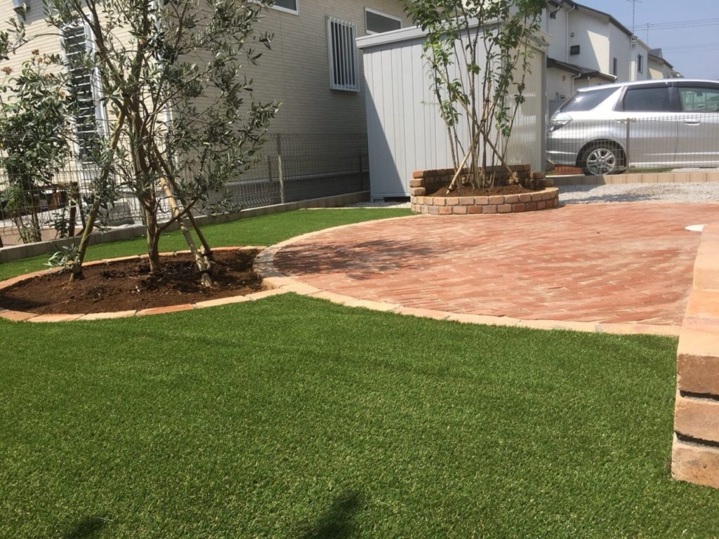メンテナンスフリーで景観を楽しめるお庭がご希望でした。人工芝の緑とレンガのサークルデッキで、お庭がとても明るい印象に。砂利で土面を覆い、しっかり雑草対策もしました。シンボルツリーの植樹で、毎日覗くリビングからの景観を楽しめます。また、大きめの物置が目隠しとなり、お庭がプライベートな空間にもなっています。