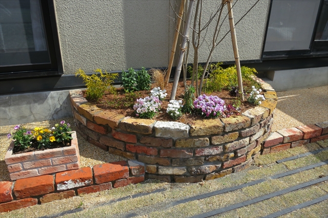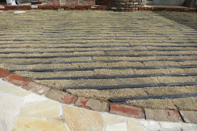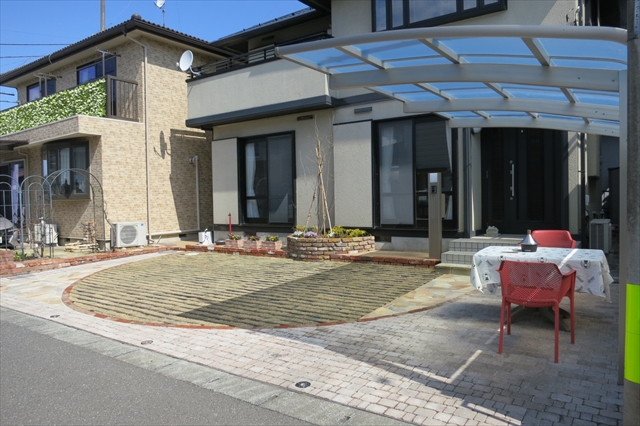 施工後は既存の門袖や駐車場などを取り払い、芝生のある解放的なスペースとなりました。車を4~5台は止めることが可能です。柔らかい色合いの天然石やレンガの縁取りでデザインされた駐車スペースは、広々としたお庭として、お客様とのアフタヌーンティやバーベキューなどもお楽しみ頂けます。