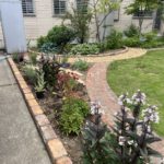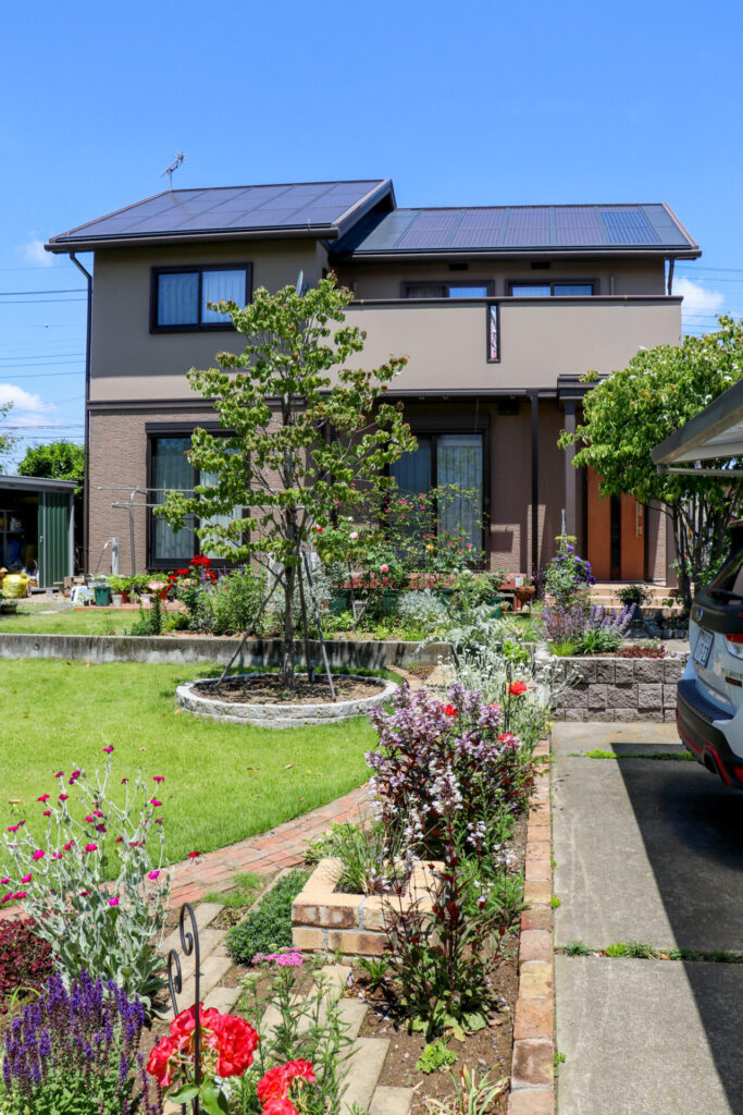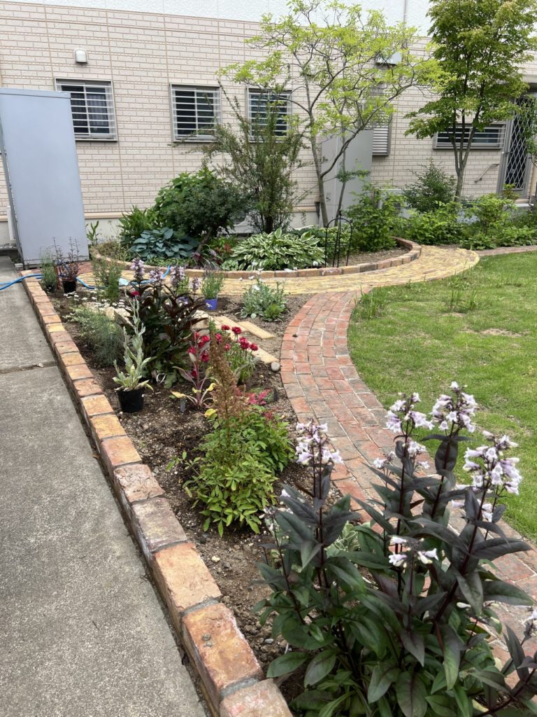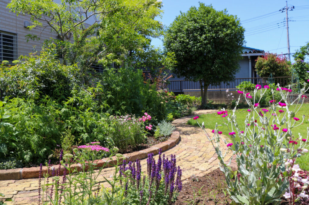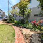 施工後にお庭の様子を拝見させていただいたところ、さっそくご夫婦で芝の手入れや素敵な植栽をされていました。新たに作った花壇や園路がこれからお庭に溶け込んでいく様子が、私たちも楽しみです。
