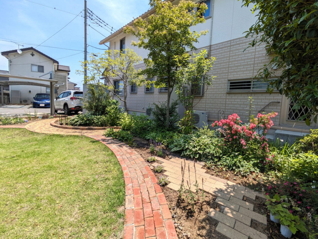 広い天然芝のお庭には、ご主人様が作られた小道があり、レンガやピンコロが敷かれていましたが、年月が経つにつれ芝が浸食し、小道が埋もれてしまっていました。せっかくの資材を再利用し、足りない部分には弊社のレンガを使用して、芝と花壇をしっかりと見切る形に整えました。これにより、植栽と芝のゾーンが明確に分かれ、管理がしやすくなりました。