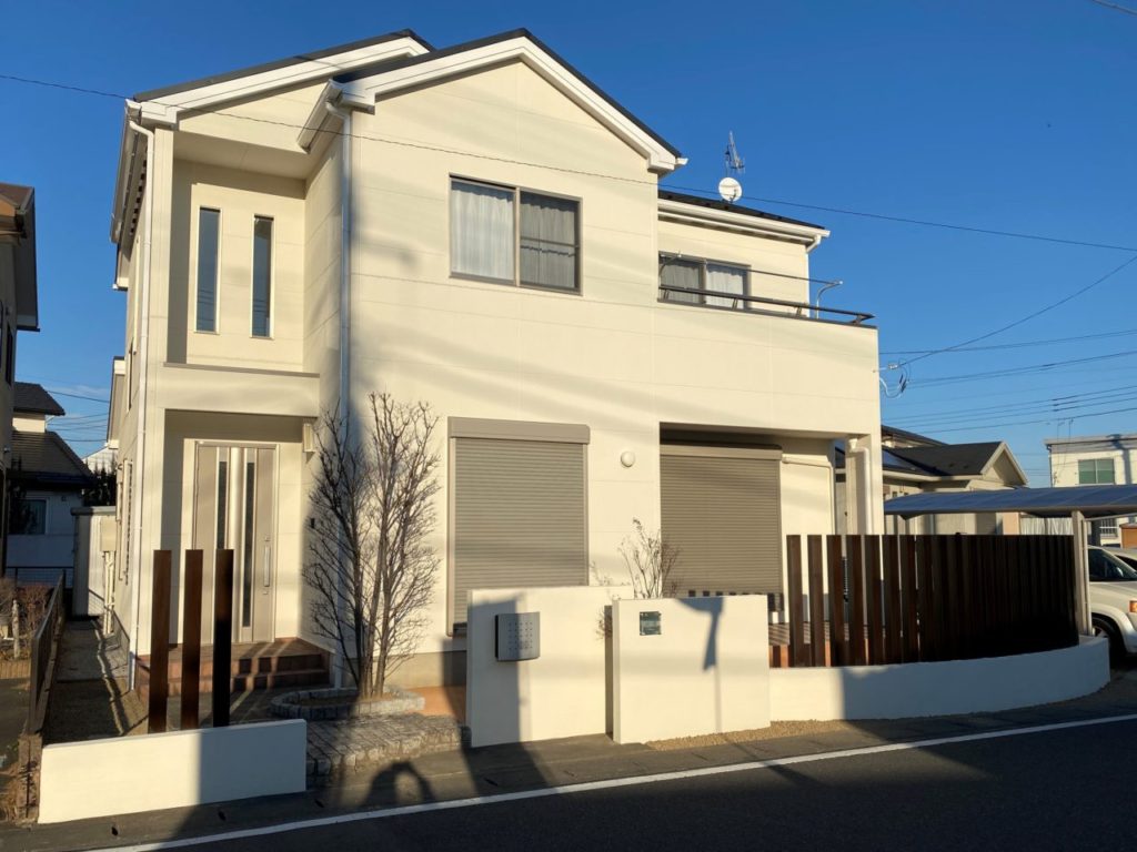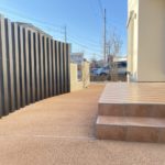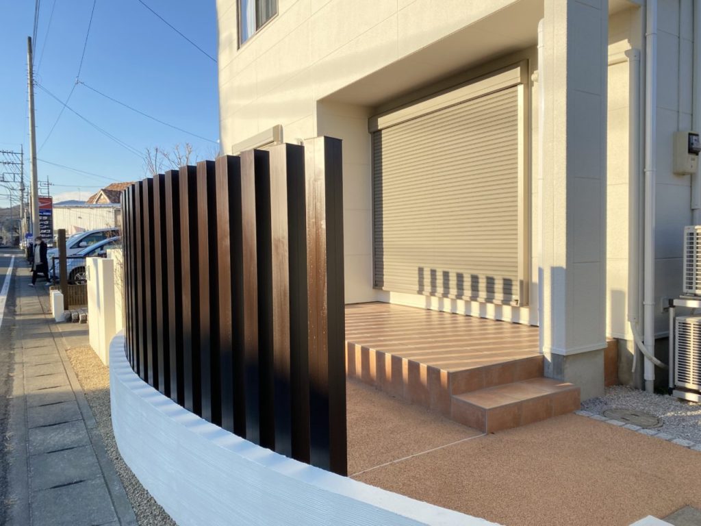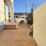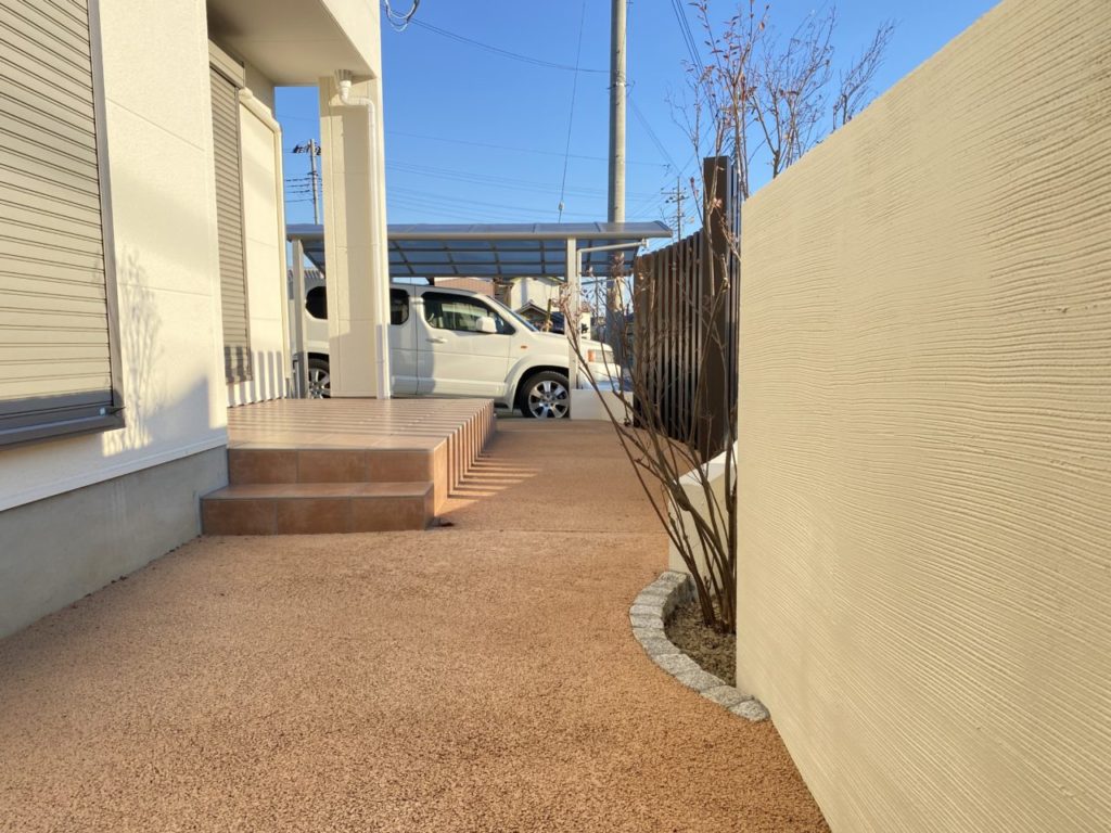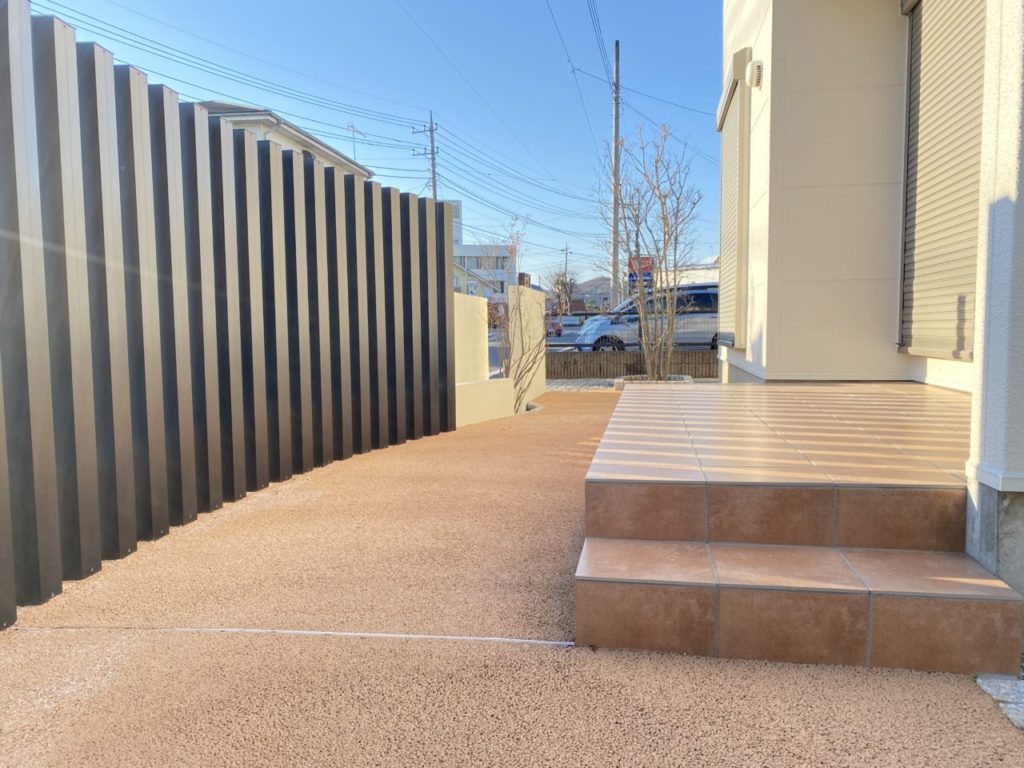 新築時に植えたコニファーが大きくなりすぎてしまい伐根し処分されたというT様。コニファーが無くなったことで、道路からの視線が気にならないよう列柱を配置しました。また、草取りが大変だった土面をガチン固で歩きやすくし、玄関から駐車場までの動線も快適になりました。リビングから出やすいタイルデッキは多目的に使えるスペースとして有効にご活用頂けます。既存の外塀も塗りなおし、お庭がきれいにリフォームされました。