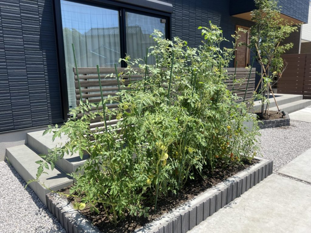 タイルデッキに隣接して、家庭菜園スペースを設けました。リビング前と駐車場を木調の目隠しフェンスで仕切ることで、プライバシーを守りつつ圧迫感のないやわらかな区切りとなり、使い勝手の良い空間に仕上がりました。ちょっとした収穫の楽しみや、お子様とのふれあいの場としてもぴったりです。日々の暮らしにちょっとした楽しみと緑の潤いを添えています。