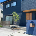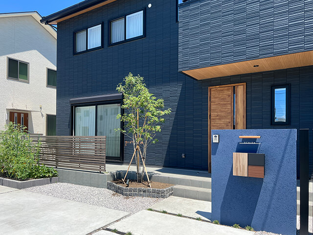落ち着いた濃紺の外壁が印象的なお住まいに合わせて、門袖には同系色のブルーの塗り壁を採用し、建物との統一感を大切にしました。木目調のポストがアクセントとなり、玄関ドアの木調デザインとも美しくコーディネートされています。全体の色味を絞ることで、上品で落ち着いた印象の外構に仕上がりました。