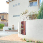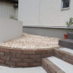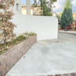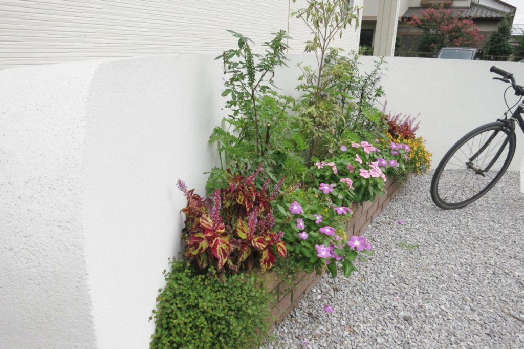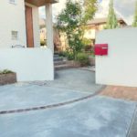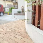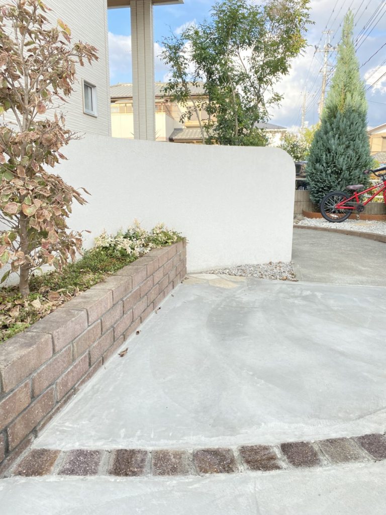 さらに、新築時の外構工事から5年ほど経ち、再び駐車スペースのご依頼を頂きました。玄関からのアプローチラインに続けて駐車スペースにもラインを描き、無機質になりがちなコンクリートの駐車場に変化を持たせました。また、明るいレンガを用いて道路からのアプローチ動線もわかりやすく。門袖の足もとには、管理のしやすい植栽スペースも設け、季節のお花をお楽しみいただけます。