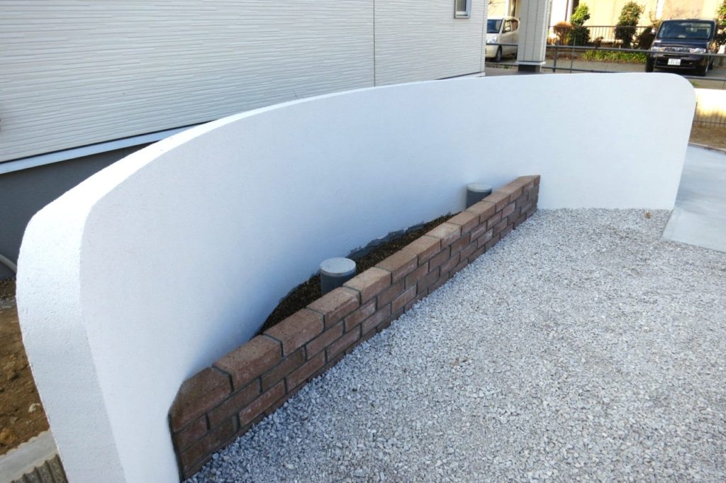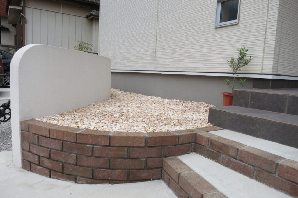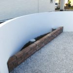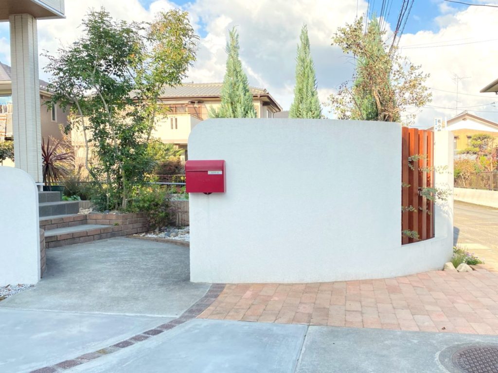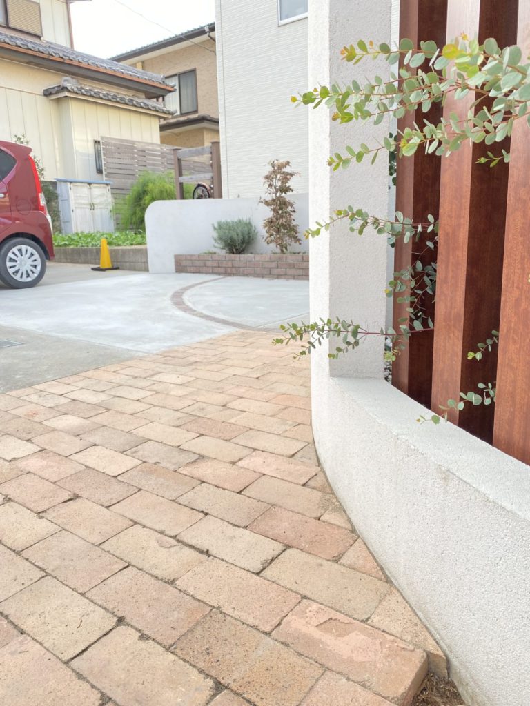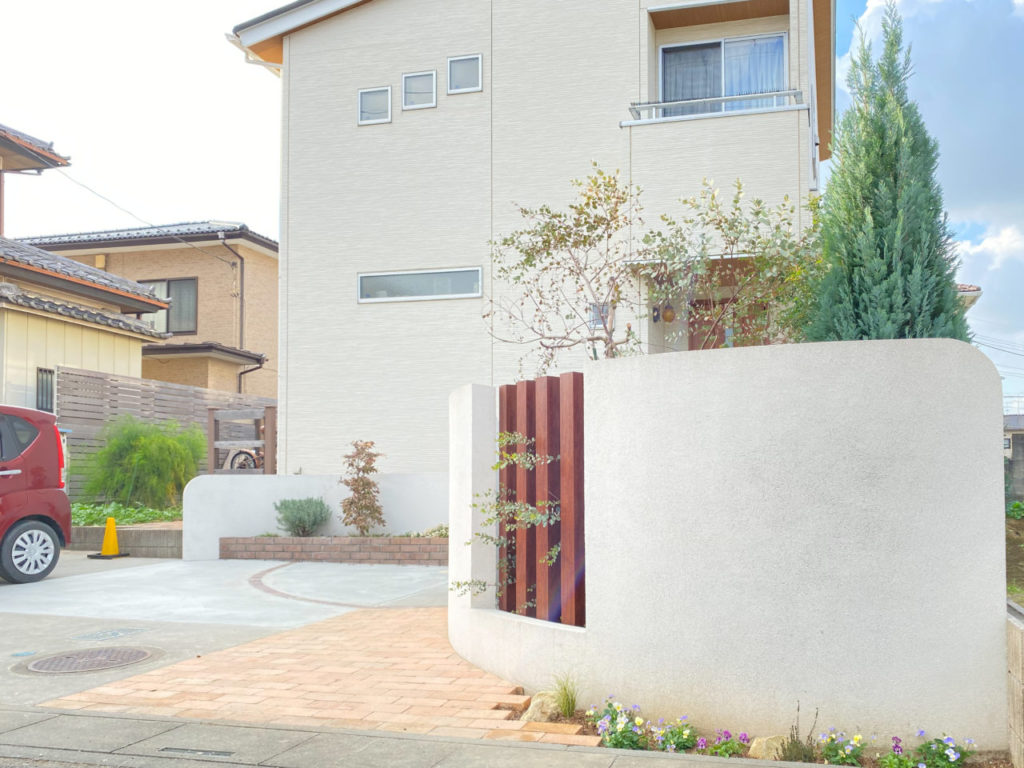 緩やかな曲線で造られた綺麗な門塀。お庭と駐車スペースを適度に仕切りながら、玄関前をさりげなく目隠ししています。玄関扉に合わせたウッドの列柱と、レンガの花壇で建物と色調を合わせ、調和のとれた空間となりました。ご主人様の休日のお楽しみ、DIYでさらに快適なお庭へと変化していくことでしょう。レンガ花壇の植栽も奥様と一緒に植えられたとのこと、楽しんで下さっているご様子に、私たちも嬉しく思っております。