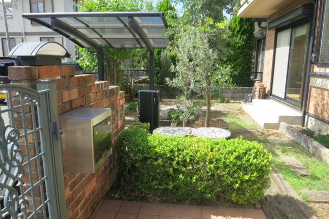 2台目の車を停める場所が門袖の前になってしまい、車があると郵便をポストに入れづらく、配達員さんにご迷惑をかけてしまっていました。このままでは申し訳ないという気持ちと、自分達の不便さを解消できるようリガーデンを決意されたY様。今では使わなくなってしまったサイクルポートを撤去し、ガーデニングスペースと駐車スペースを拡張しました。門柱は重厚感ある明るい表情に変わりました。配達員さんもこれなら楽々ですね。