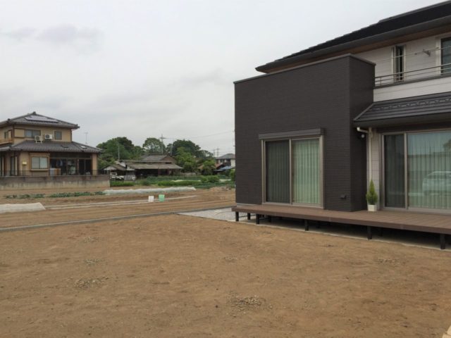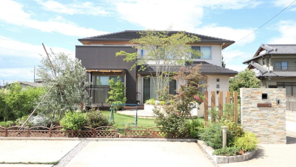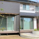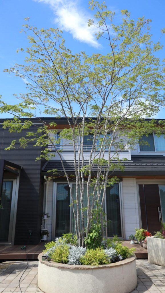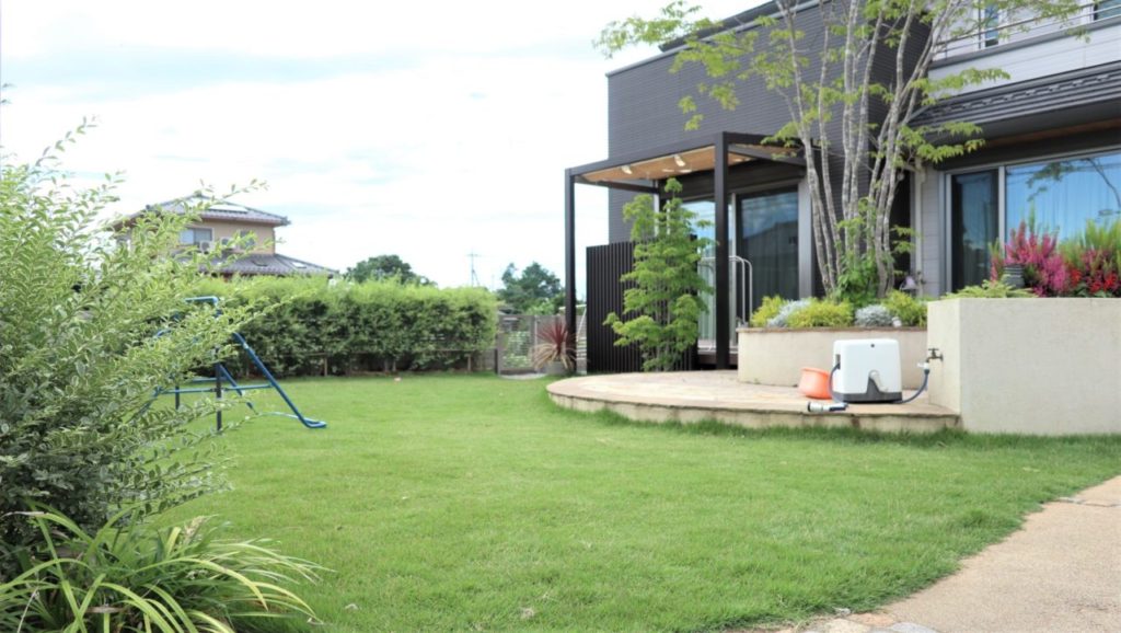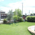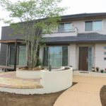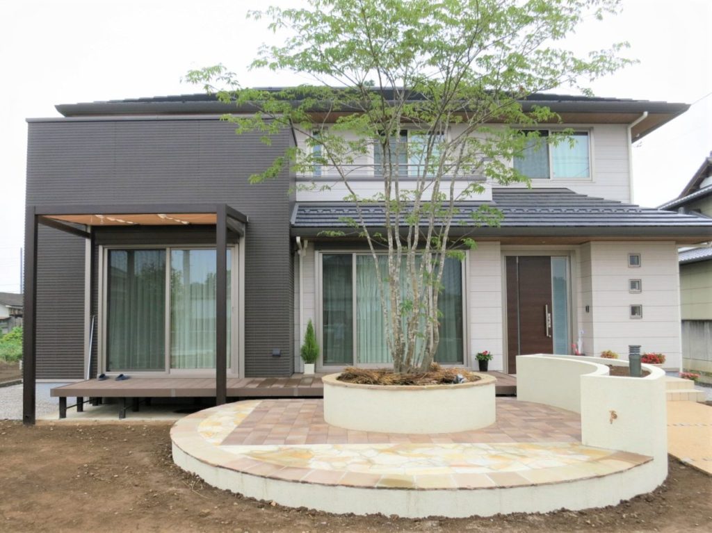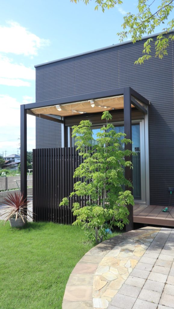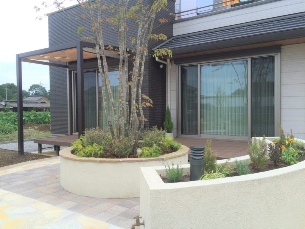 既存のウッドデッキから続くサークルデッキやテラス屋根など、お庭での時間を快適にしてくれるアイテムです。植栽によって道路側からの視線をさり気なく遮り、緑いっぱいのくつろぎ空間になりました。