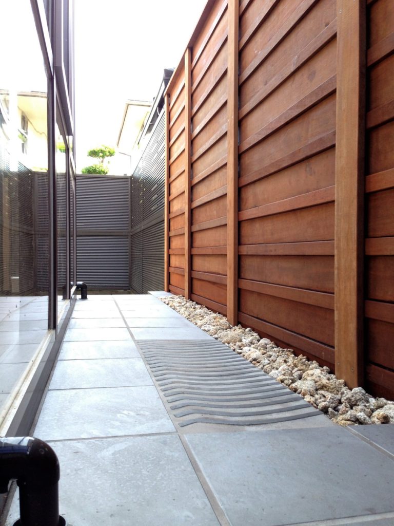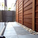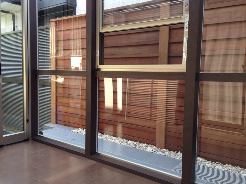 天然木のウリン材でデッキと目隠しフェンスを構築。ウッドフェンスからダーク色のアルミフェンスに切り替え、テイストが融合した飽きのこない空間に。また、タイルデッキは三州いぶし瓦敷きで日本特有の清楚な美しさを。陶器の立水栓と天然石の手洗い鉢が加わり、より和モダンな雰囲気に。そして、ガーデンルームココマで落ち着いた雰囲気の新たな一部屋が加わりました。