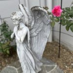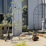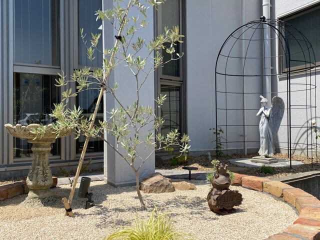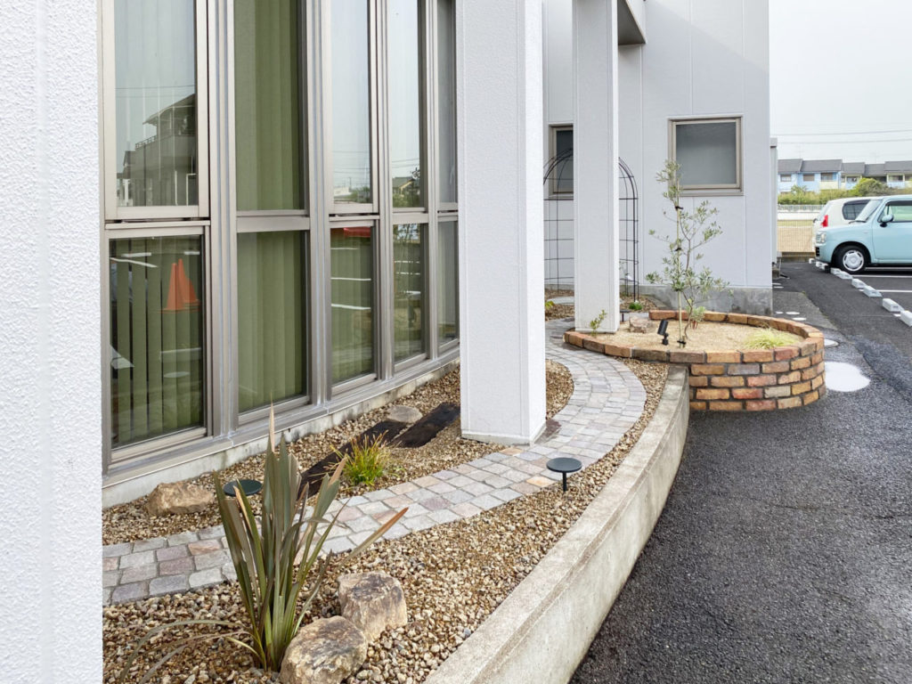 大きな出窓の曲線に沿った花壇は、待合室側からの眺めも駐車場からの眺めも楽しめるよう、たくさんのガーデンオブジェを飾り、天然石や砂利・枕木等を使ったかわいらしいロックガーデンとなりました。天使を囲むアイアンのガゼボは、つるバラを這わせて楽しんでいただけます。花壇の植栽は常緑と多年草を中心に植え、砂利の下は防草シートで整えました。