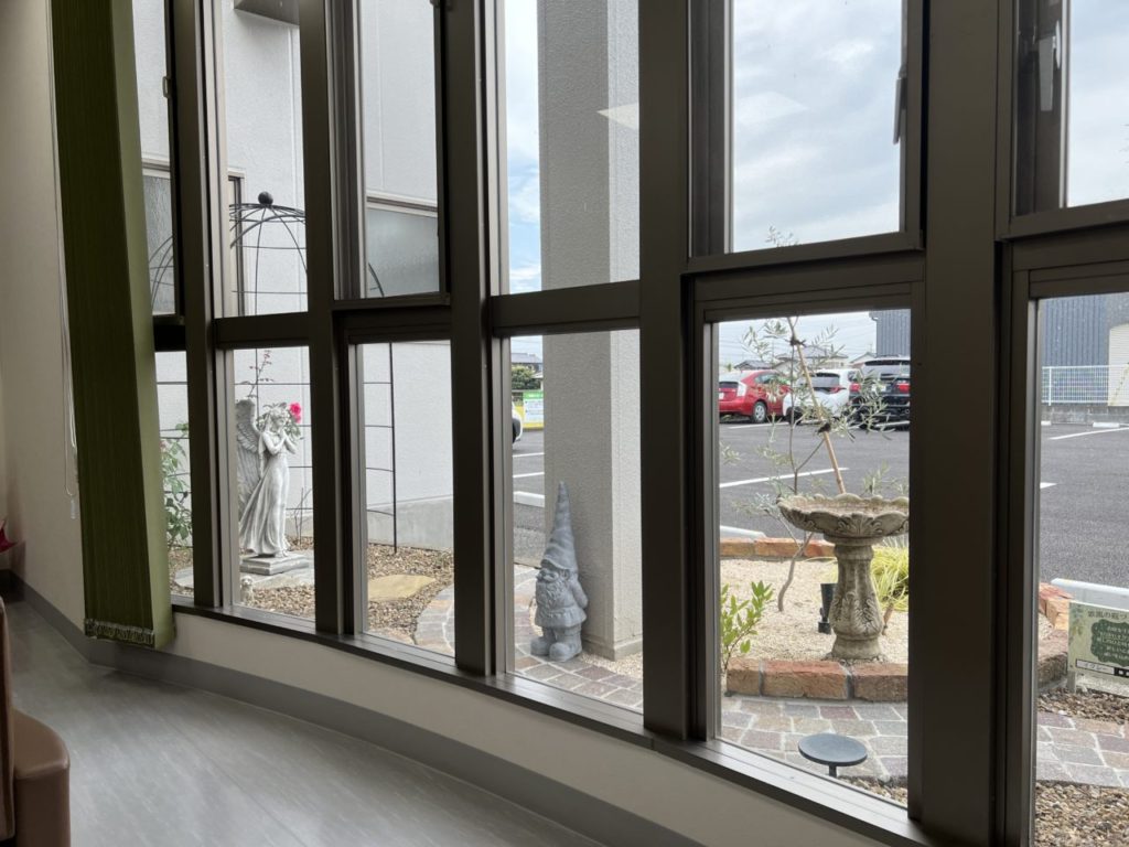 夜はライトアップで優しく花壇を照らし、安らぎを与えてくれます。待合室での時間は、長く感じてしまうこともあるかと思いますが、お庭を観て穏やかな気持ちになっていただけたら嬉しいです。