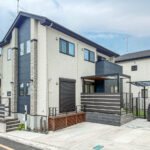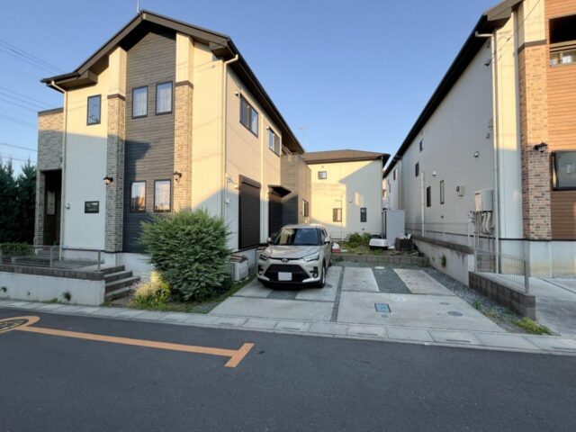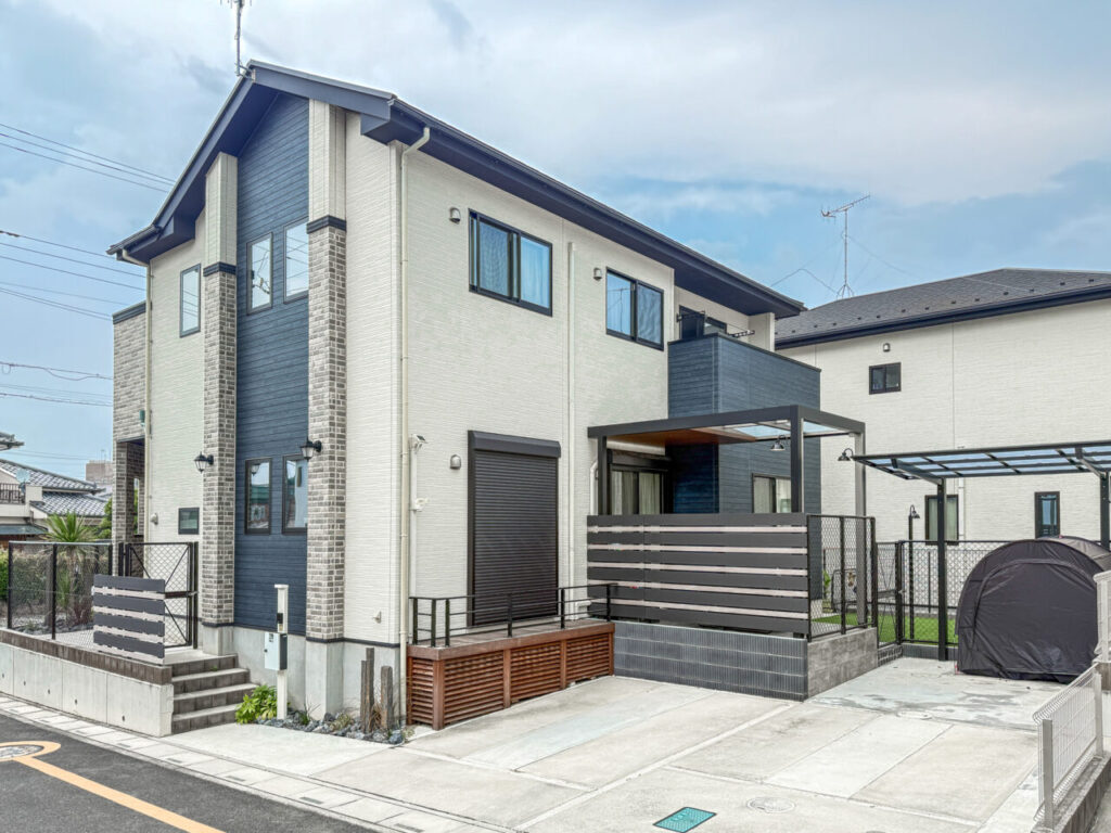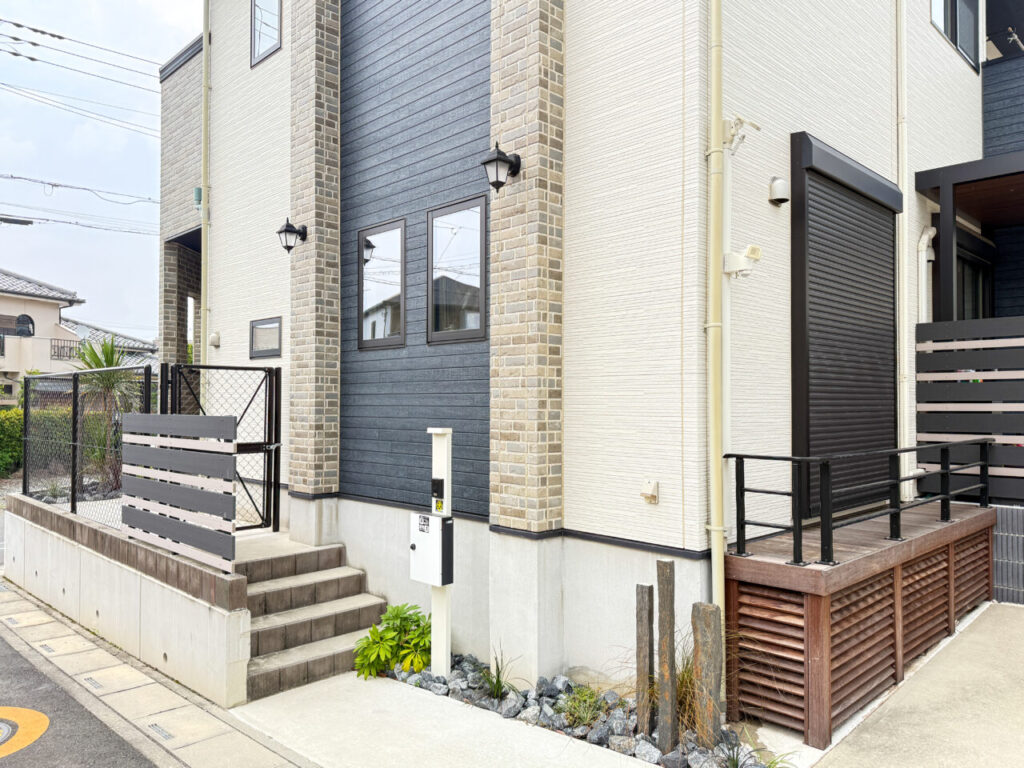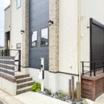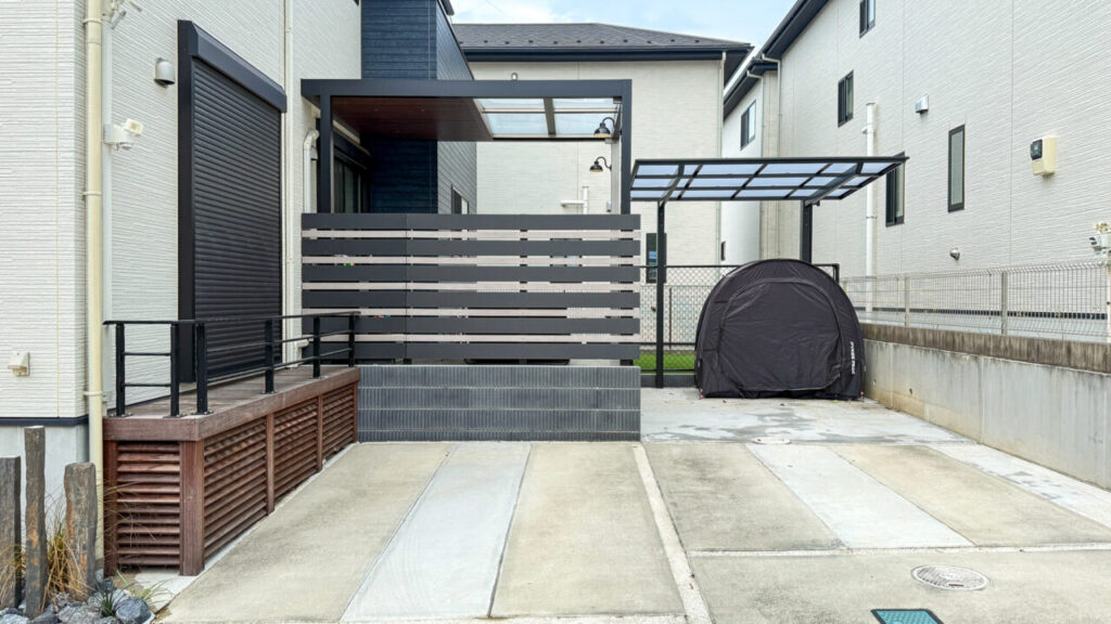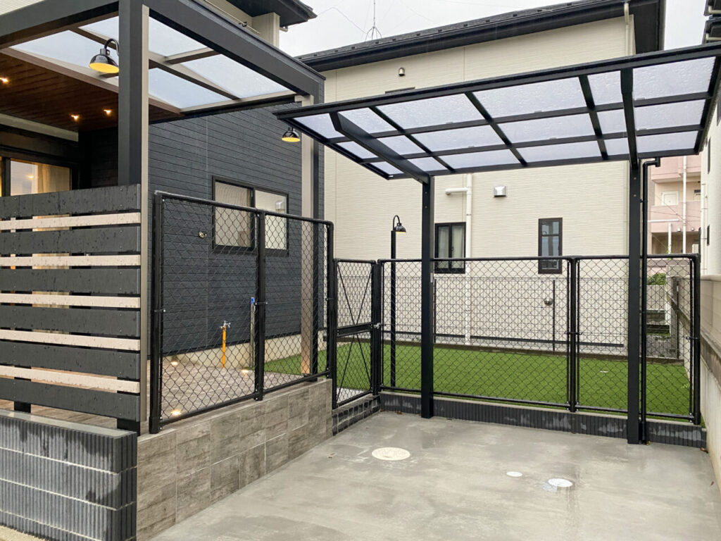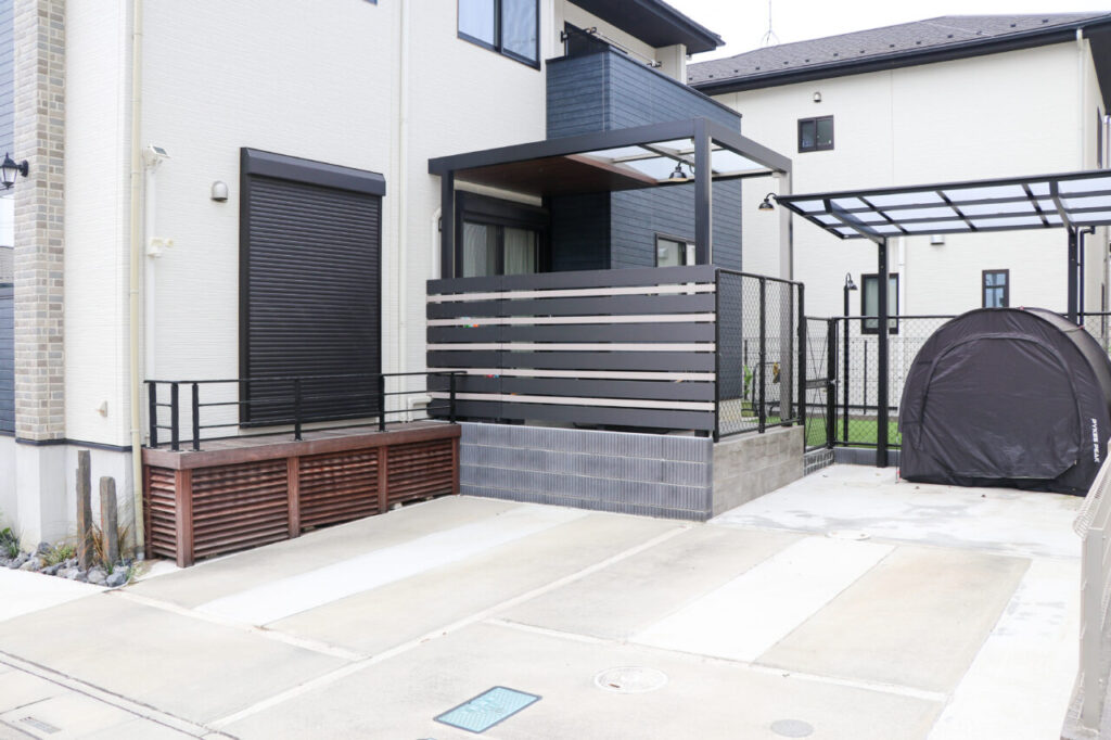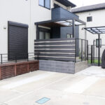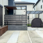 安全面にも配慮し、敷地全体をブラックのPCフェンスで囲い、ワンちゃんやお子さんが外へ飛び出さないように設計。駐車場側にはゲートを設け、庭との行き来のしやすさと安心感を両立しました。駐車場はスペースを広げ、奥にサイクルポートも設置。日々の暮らしに欠かせない利便性もしっかりと確保しています。