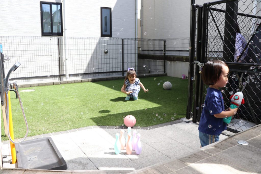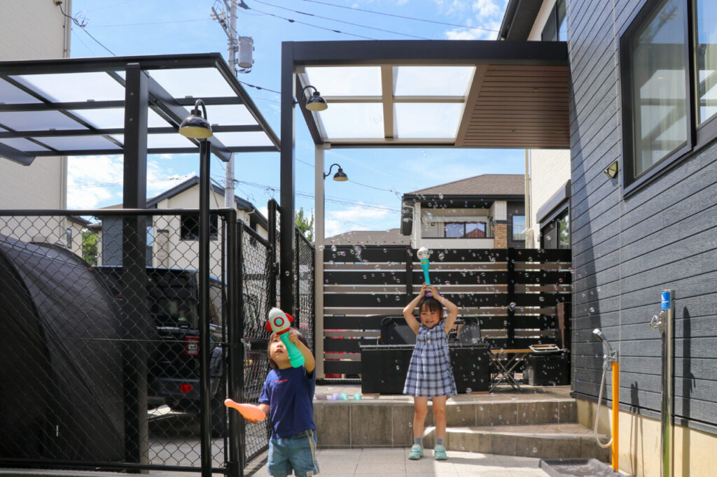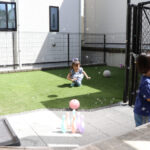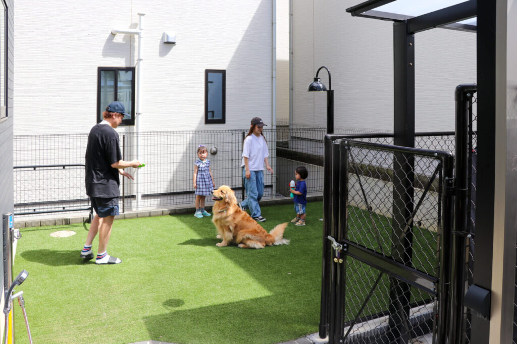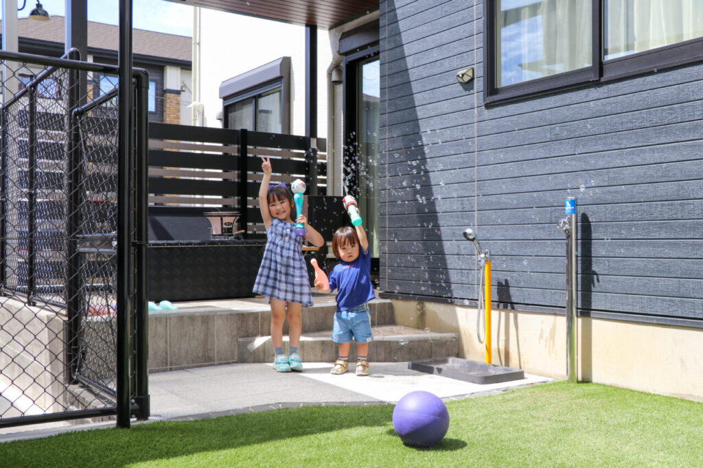 デッキからつながるお庭には人工芝スペースを確保し、ワンちゃんのボール遊びやお子さんのシャボン玉、プール遊びなどにもぴったり。ガーデンラウンジからも目が届きやすいため、小さなお子さんのいるご家庭にも安心です。