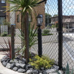 玄関まわりは以前の植木を整理し、手間のかからないロックガーデンに。天然石の列柱がシンプルな中にも印象的なアクセントとなり、外構全体の落ち着いたデザインと調和しています。全体をブラックを基調にまとめたことで、建物との一体感も生まれ、洗練された雰囲気に仕上がりました。