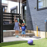 人工芝のやわらかな足ざわりは裸足でも心地よく、自然と外遊びが日常の一部に。シャワー水栓やドッグポールも設置し、機能面も充実させました。庭全体は落ち着いたトーンでまとめつつ、オレンジの立水栓がさりげないアクセントになっています。