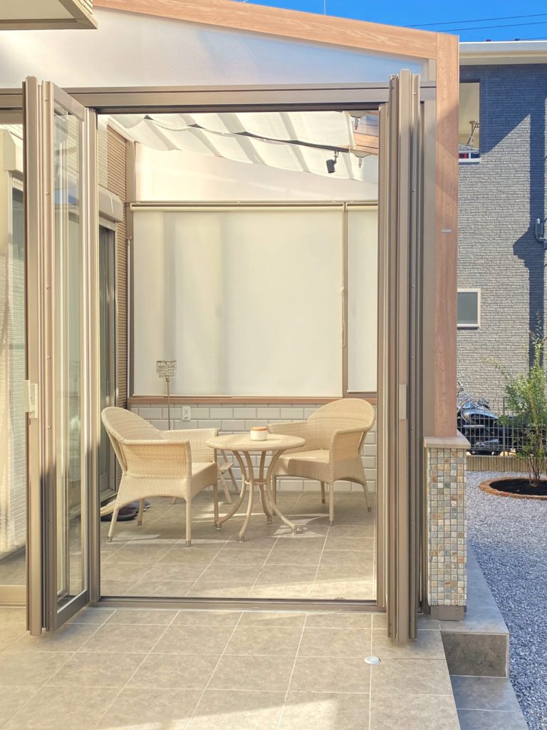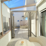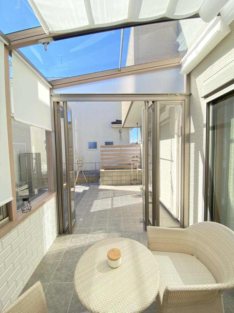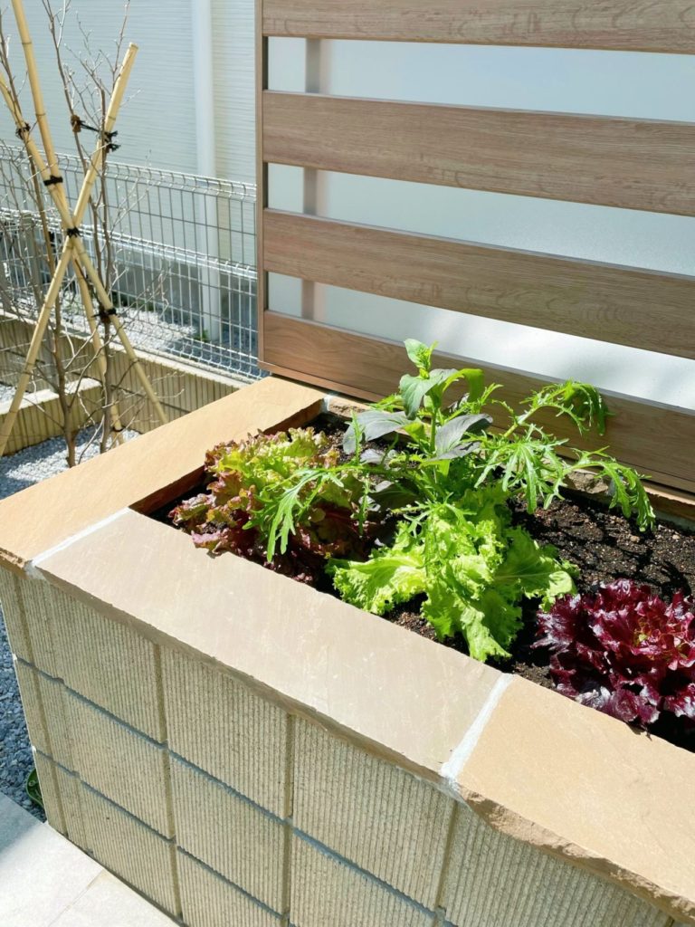 | 施工スタッフコメント | ココマL字腰壁タイプ。ガーデンルームから続くタイルデッキには埋め込み照明もあり、昼間は共働きで不在がちなご夫婦が、夜でもゆったりと楽しめる空間です。タイルデッキに目隠しを兼ねた腰高の花壇には、ハーブ等を植え込みキッチンガーデンとしてお使い頂いています。 |