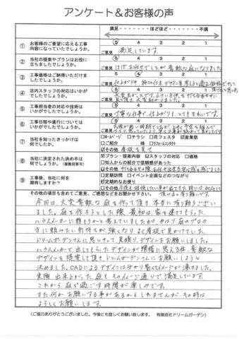 ハウスメーカーで出してもらったデザインが滑稽に思える位、素敵なデザインを提案して頂き、ドリームガーデンさんにお願いしようと決めました。