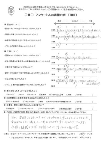 埼玉県熊谷市H様 -1903- 2019.08.26 皆さん雰囲気よく話しやすいので、打ち合わせも楽しくスムーズにできました。全体的にとても満足のいく形に仕上げて頂きありがとうございます。今後も植栽のこと等、相談にのって頂けたらと思います。 この施工事例を見に行く < PREVALLNEXT >