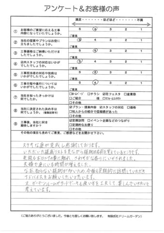 自分たちだけではどの様に庭を活用したらいいのか分からず、引っ越ししてから1年間ほったからしでした。しかし、使い勝手の良いプランを提案していただき、素敵な庭が出来ました。価格は高いですが、ガーデンルームをつけてよかったと感じています。外でも...