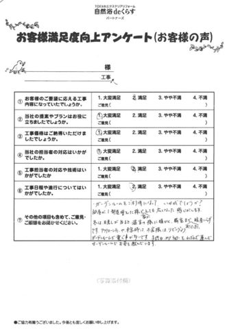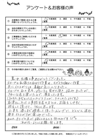 暑い中、外構工事ありがとうございました。スロープの乱張りの石切り作業やモザイクの細かい作業・・・共に仕上がりが素敵で、気に入りました。スロープの石の色もいろいろと見せて頂き、悩みましたが、きれいな色を選べたので、満足しています。(子ども...