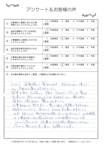 植栽のやり方や、メンテナンスのやり方などの取説などを頂けると助かります。今はInternet等で自ら調べて、庭・植栽作りを試行錯誤でやっています。今回の件では、色々と細かい所にまでご対応頂き、有難うございました。出来栄えについては大変満足してい...