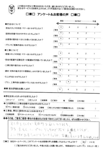 この度は、素敵な庭にリフォームして頂きまして、どうもありがとうございました。手間を惜しまず、とても丁寧な作業に信頼と安心感を抱きました。そして、庭が完成した後も「これからが本当の付き合いです」と仰って頂き、大変嬉しく思いました。新しい庭...
